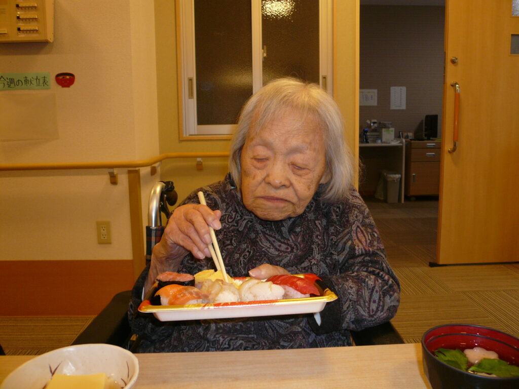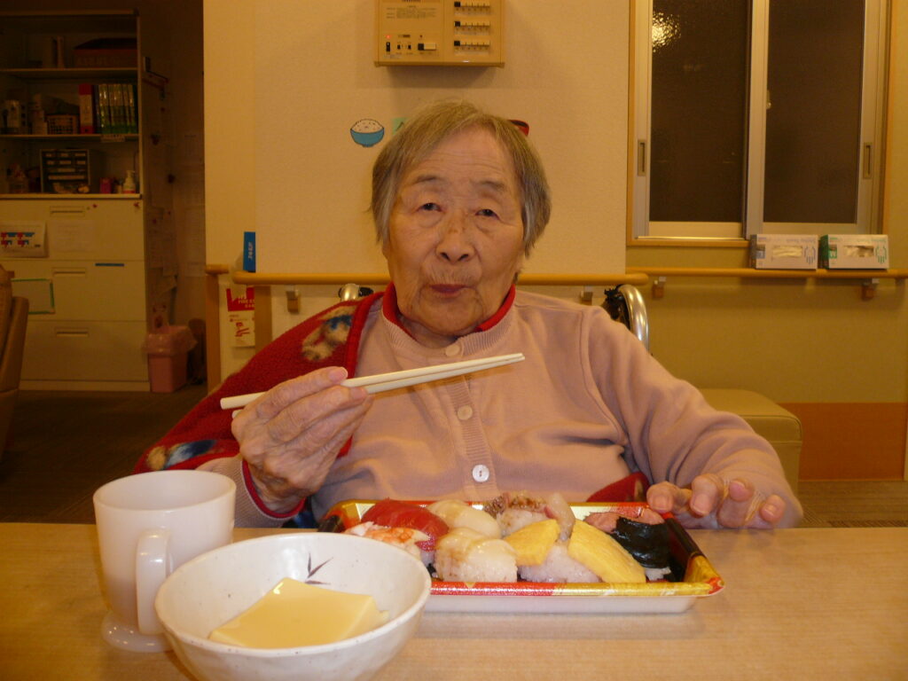 クリスマスソングをみんなで歌い、お寿司やケーキを